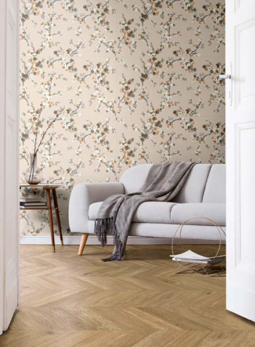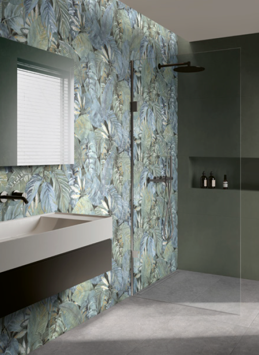 Serie Vida e Serie Decora: Pavimentos e revestimentos de parede com efeitos florais em estilo de papel de parede e diferentes formatos, tanto em porcelanato como em revestimentos de parede.