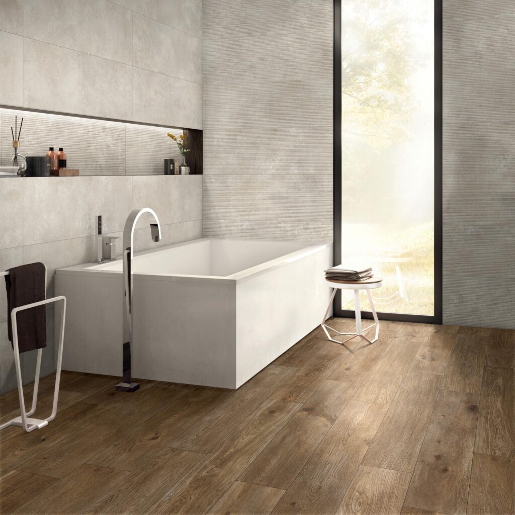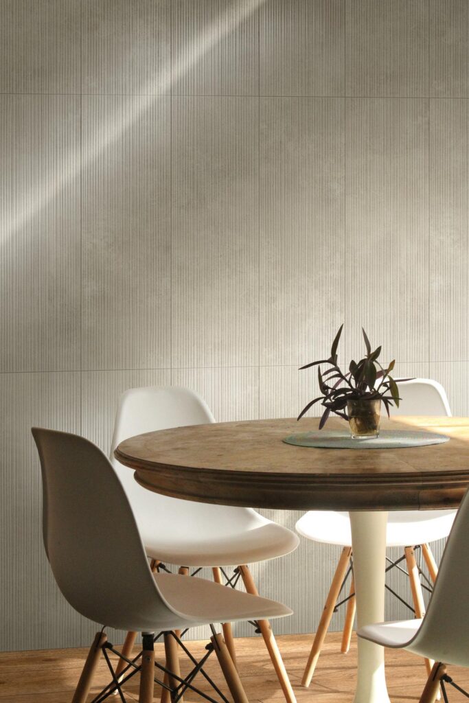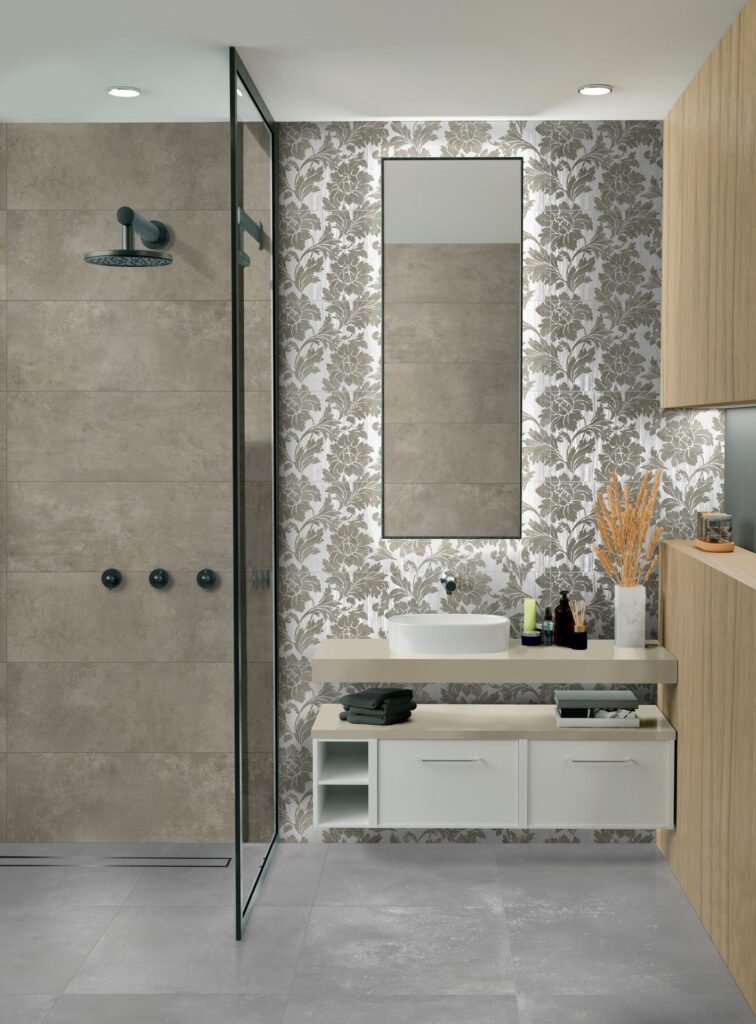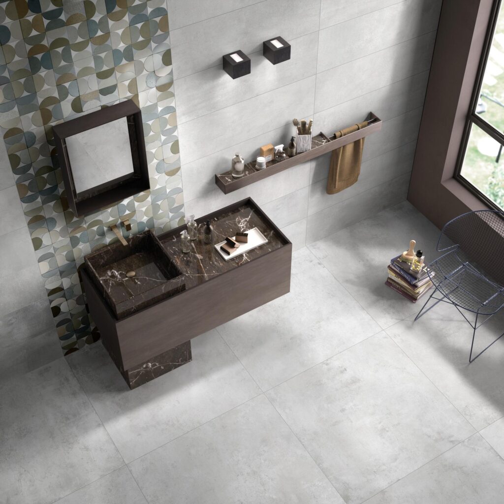 Seis cores neutras, tanto claras como escuras, são utilizadas com grande versatilidade em quatro tamanhos, 100×100, 60×120, 60×60 e 30×60 cm, para esquemas de design de look total muito modernos.