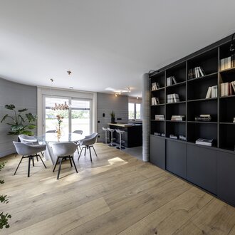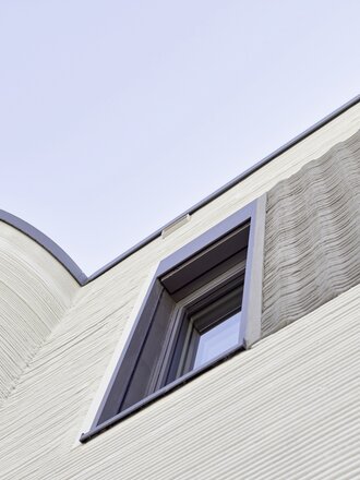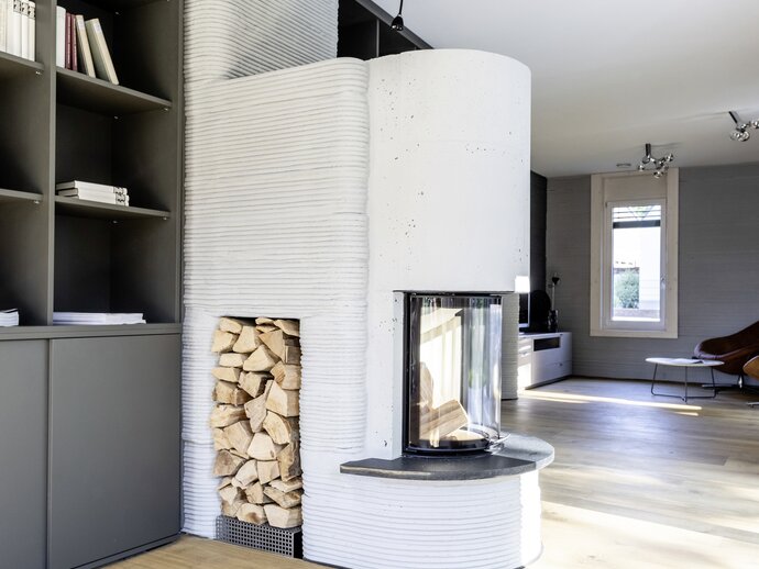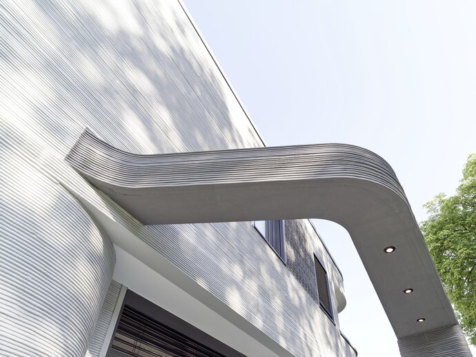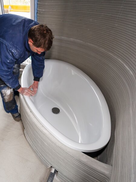 Um momento emocionante para arquitectos e artesãos foi a inserção dos produtos de banho na forma impressa. Mas não só a instalação das duas bases de duche BetteFloor nos componentes pré-fabricados decorreu sem problemas, como a Banheira BettePool Oval também se enquadrou perfeitamente no design da parede arredondada da casa e do avental de banho, que também tinham sido impressos em betão. Uma experiência que dá frutos: