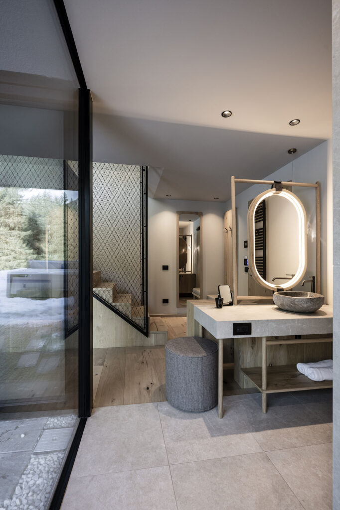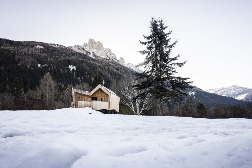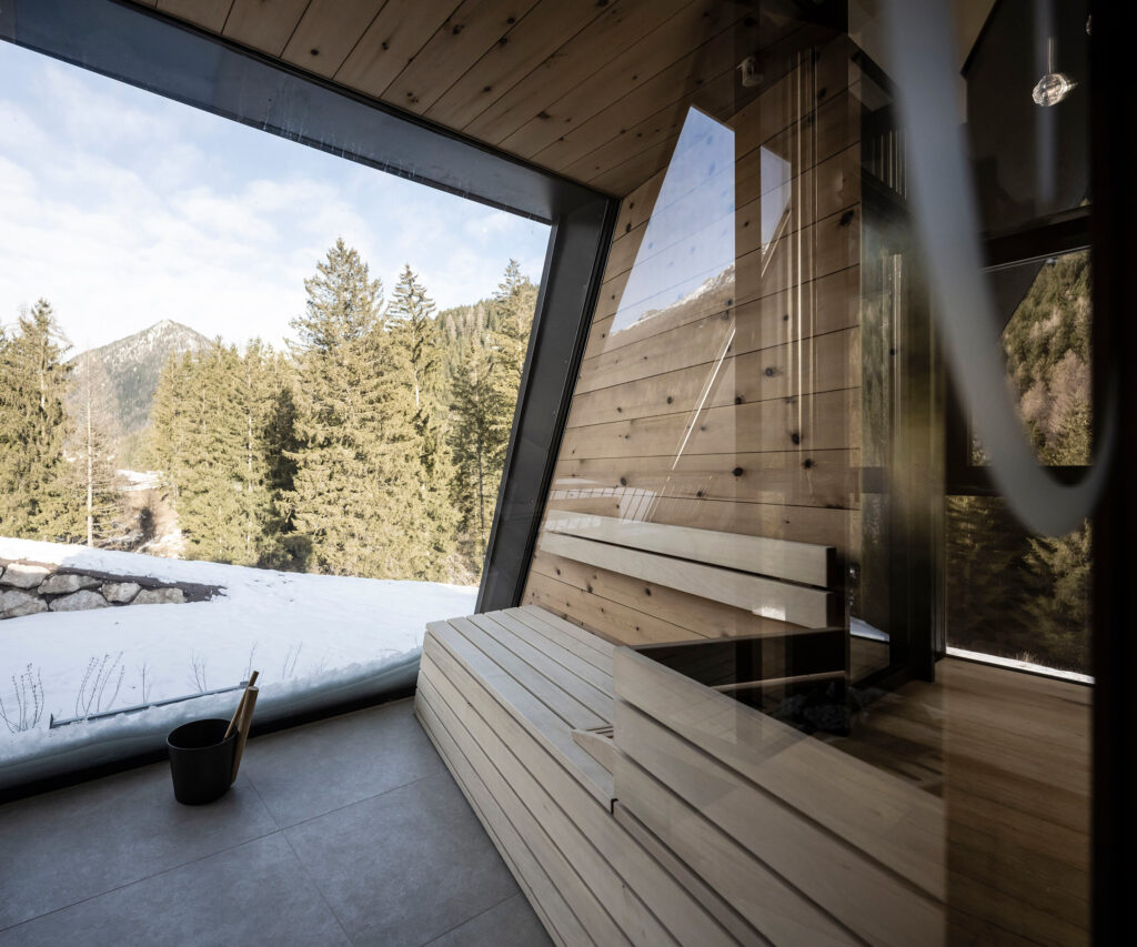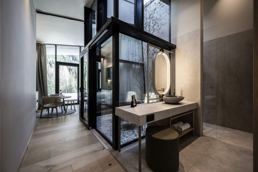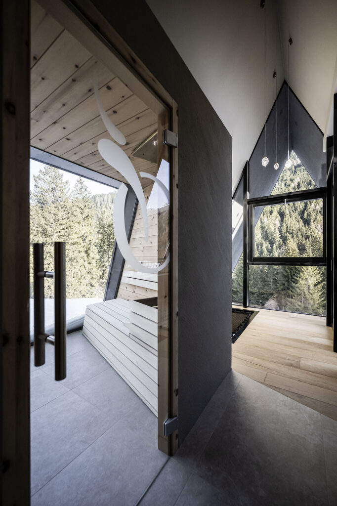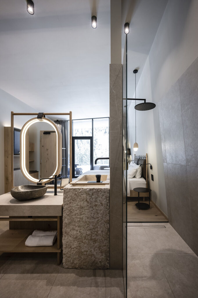 Os materiais cuidadosamente seleccionados também ajudam a reforçar a simbiose com a paisagem. O revestimento cinzento áspero das paredes exteriores evoca as duras rochas das Dolomitas, o mobiliário em madeira de carvalho nodoso faz referência à tradição alpina e todo o esquema de cores alterna tons claros com verdes, num diálogo visual contínuo com o mundo exterior.