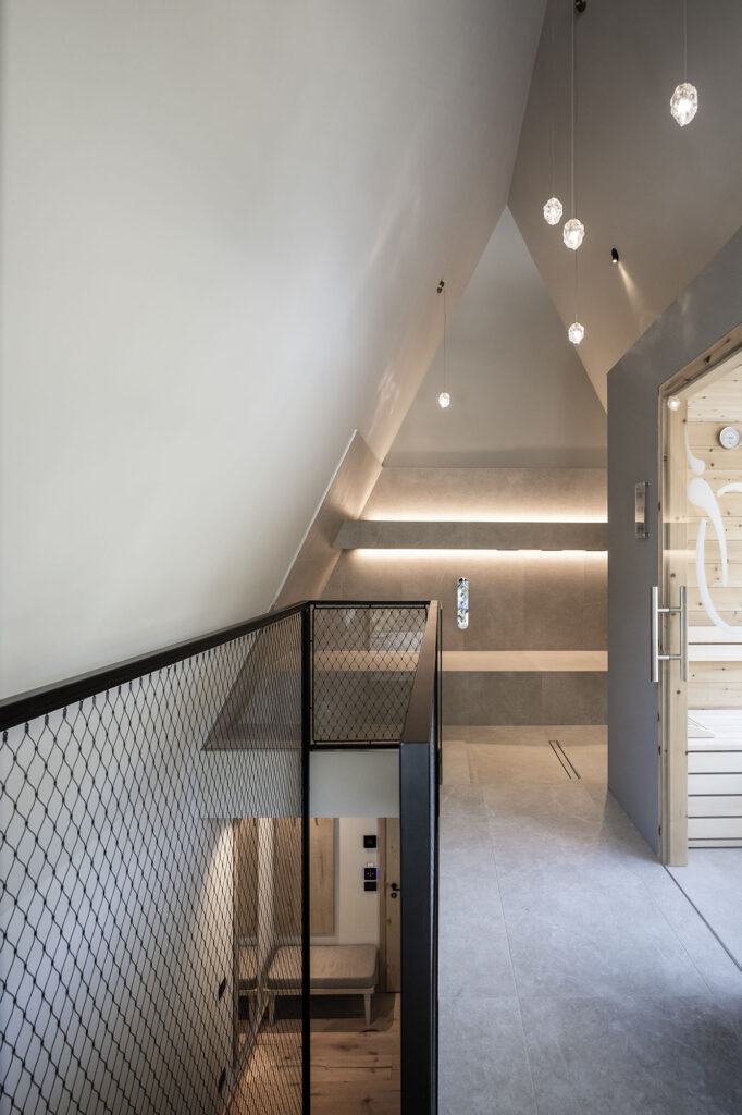 A estrutura do novo edifício, perfeitamente integrado com o hotel existente – dez quartos e um ginásio – repete o contorno das próprias montanhas, a sua altura sobe até dois andares na suite e depois desce gradualmente até quase nada na parte subterrânea, com o seu telhado coberto de relva sobre os últimos quartos e o ginásio, reforçando o conceito de imersão total na natureza que está na base de todo o projeto.