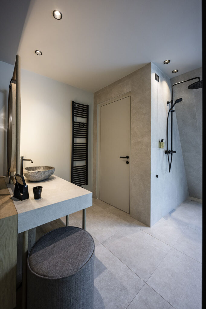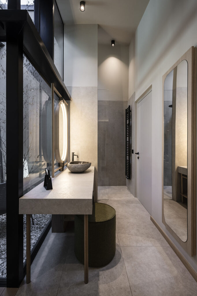 Para conseguir a harmonia geral, “a casa de banho tinha de ser o elemento unificador, comum a ambos os tipos de divisões”, disse-nos NOA, “por isso precisávamos de um azulejo com efeito de pedra em tons quentes que se enquadrasse em ambos os estilos, Floresta e Água, e desse aos interiores um ambiente natural. Achámos a coleção Realstone_Argent perfeita para este papel”.