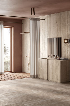 A amplitude da gama alarga as potencialidades de aplicação de Realstone_Travertino, partindo das grandes placas de 120×278 cm com uma espessura fina de 6 mm – visualmente muito marcantes e adequadas para revestir bancadas de trabalho e outros elementos de mobiliário duráveis e cómodos que conservam as suas qualidades técnicas e o seu aspeto ao longo do tempo – até aos tamanhos de 60×60 e 30×60 cm.