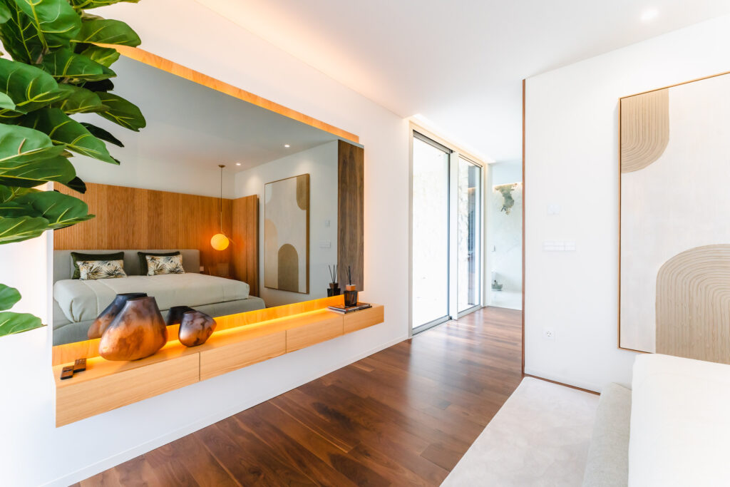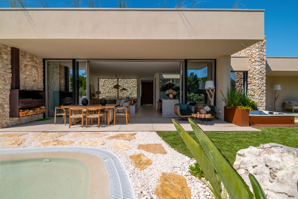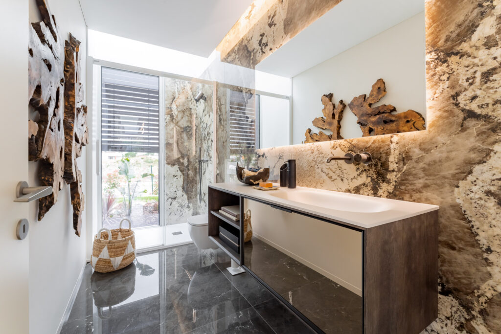 Este projeto, uma parceria entre Yartek e Monark Arquitetura, destaca-se pelo uso de revestimentos de argila natural da Matteo Brioni, que se integram harmoniosamente com elementos como pedra natural e piscinas de areia. A impermeabilização foi realizada com as lâminas ECODRY80 da Revestech, e as divisórias de banho da série VITA da Profiltek estão presentes em todos os chalés.