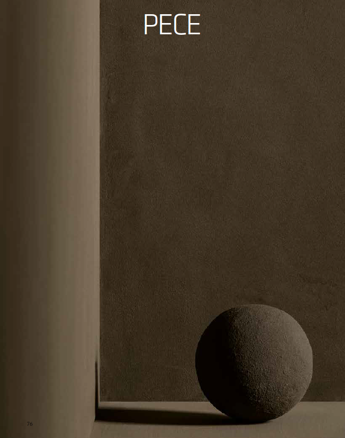 Esta tonalidade intensa, de um negro profundo com subtis nuances minerais, nasce da paixão de Brioni pela riqueza cultural, estética e simbólica de Portugal. O arquiteto e artesão italiano viu na terra portuguesa não apenas uma matéria-prima, mas uma memória viva — um solo carregado de história, tradição e alma. A cor Pece não é apenas aplicada: é sentida, evocando os tons escuros das rochas atlânticas, das estruturas em taipa, das sombras da calçada e da sobriedade elegante das construções vernaculares portuguesas.