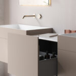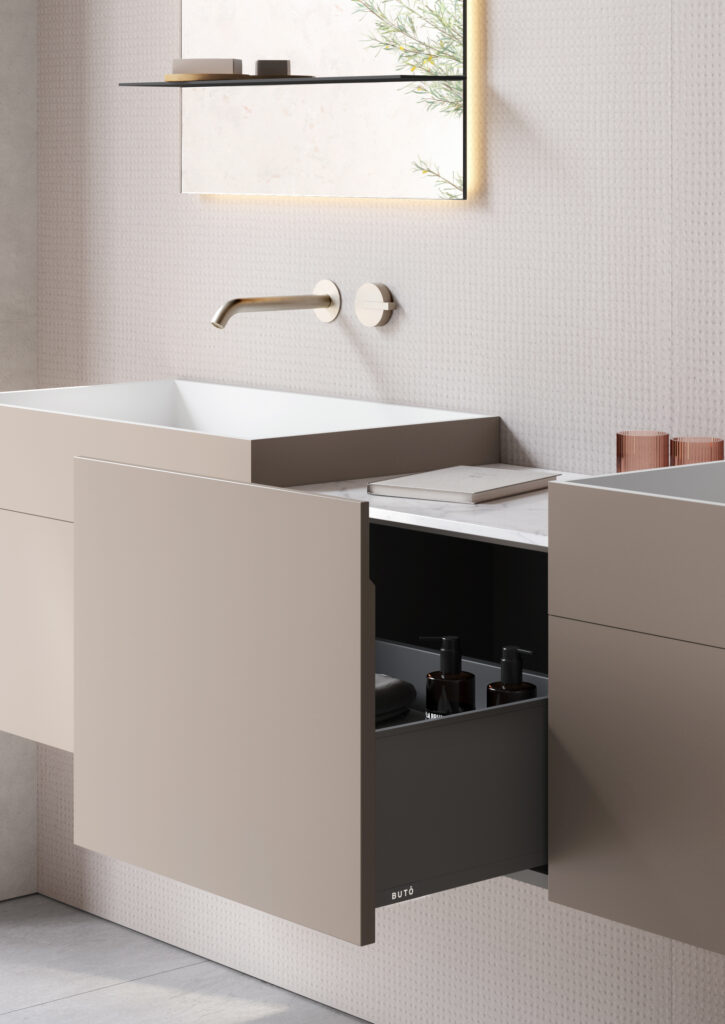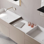 Com a possibilidade de personalização à medida e com diferentes acabamentos de madeira, lacas e lavatórios de design em Corian e Solid Surface.