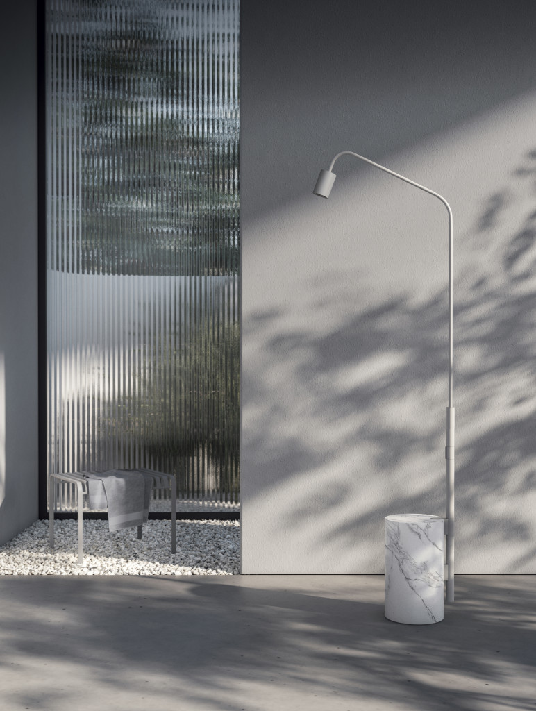 A coluna de duche exterior MARMOREA da FIMA Carlo Frattini representa uma nova abordagem ao design de espaços exteriores, onde o bem-estar, a arquitetura e os materiais naturais se unem numa solução única.