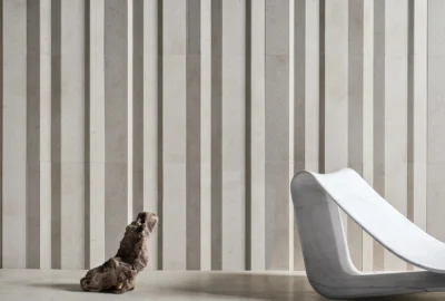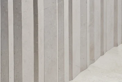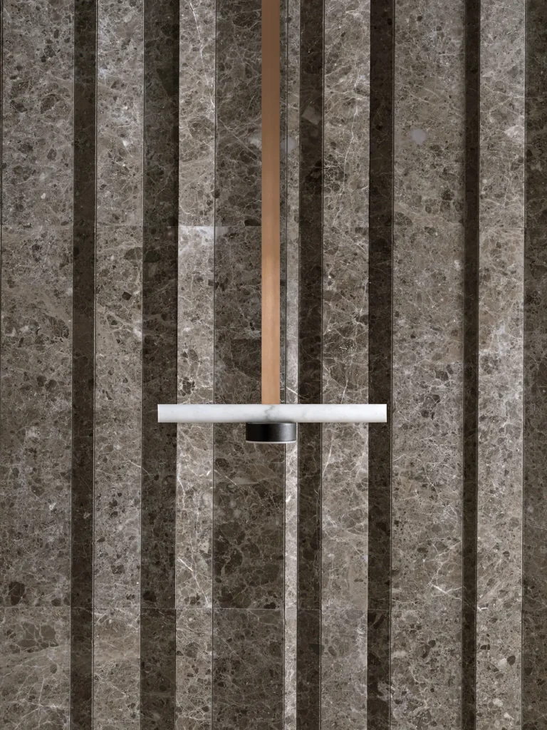 A partir de cinco peças de diferentes larguras e ângulos, o atelier criou três placas que formam padrões contínuos. A possibilidade de colocar as peças torna quase impossível perceber onde começa uma e acaba outra. As pedras podem ser colocadas em diferentes ordens e, graças a esta repetição e alternância, cada cliente pode obter uma parede e um resultado únicos. A versatilidade das placas permite colocá-las viradas para a esquerda ou para a direita, criando transformações acentuadas consoante a forma como acolhem a luz e transformando assim o ambiente em que se encontram..