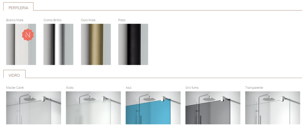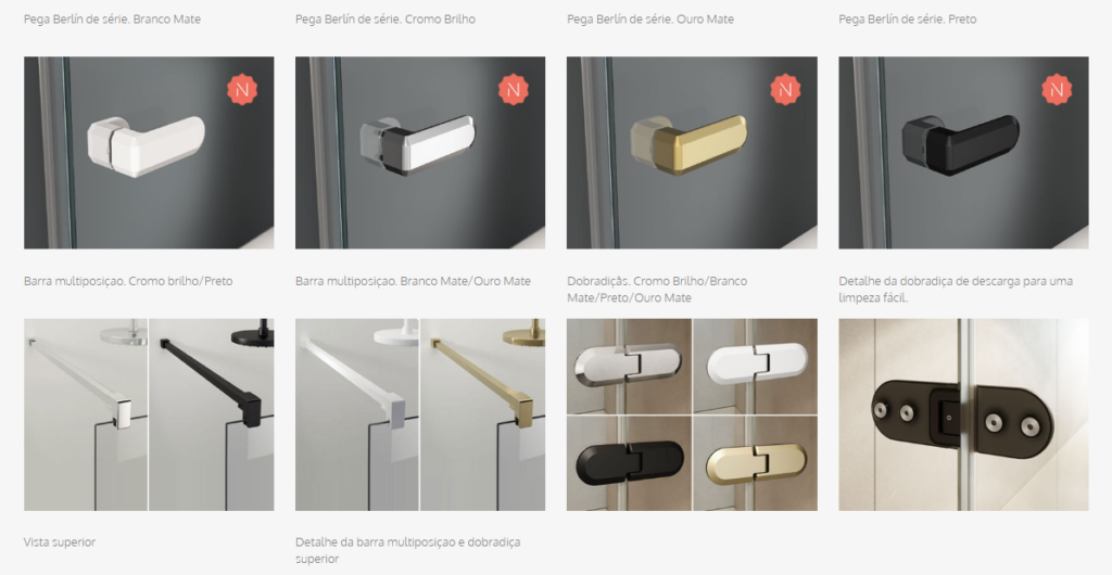 Acabamentos disponíveis: Cromo, Preto, Ouro e Branco mate.