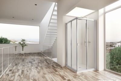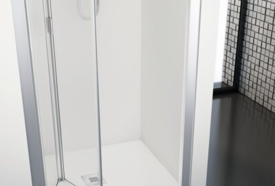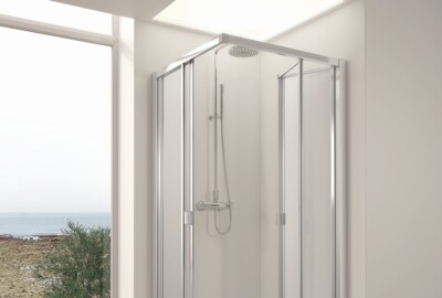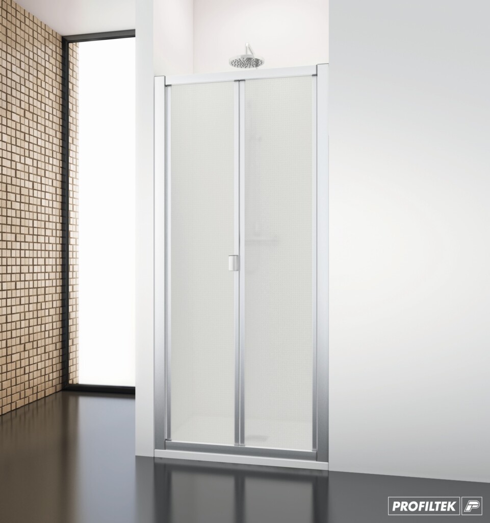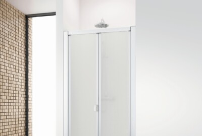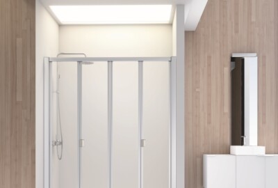 »Divisória para banheira e duche com folhas dobréveis para o interior e portas corrediças.