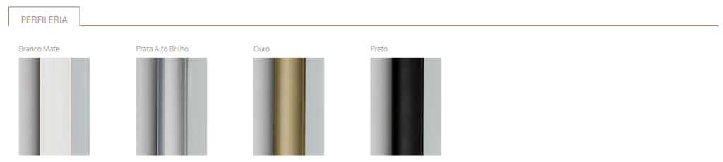 - Acabamentos dos perfis em Prata Alto Brilho, Branco Mate, Preto e Dourado.