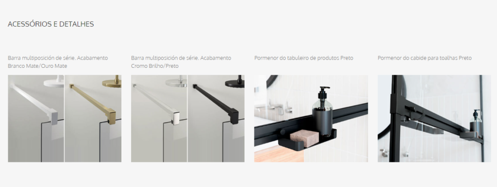 - Modelo com possibilidade de combinação de diferentes acabamentos, vidros e acessórios.