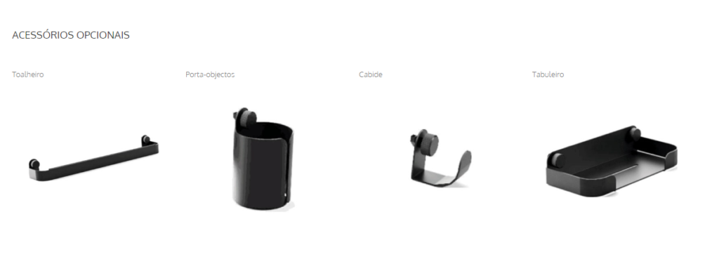 - Acessórios opcionais disponíveis: cabide, toalheiro, tabuleiro e porta-objectos nos acabamentos branco mate, cromado, preto e dourado.