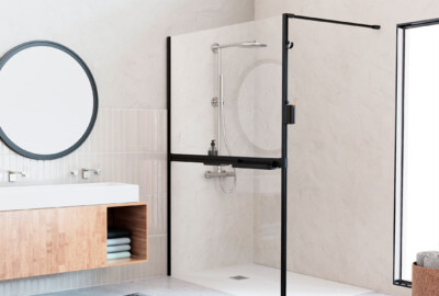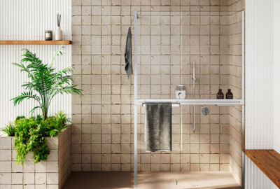- Divisória de banho e duche com painéis fixos com painéis separados por perfis horizontais.