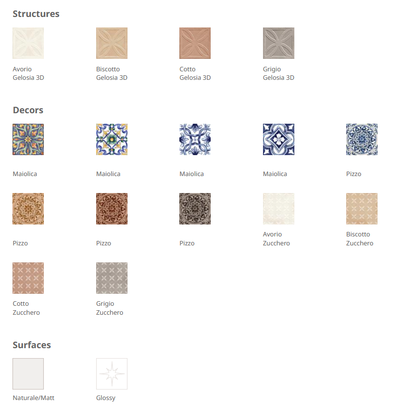 | O material de inspiração é a terracota feita à mão, com arestas muito bem definidas e uma superfície ligeiramente mosqueada. Estas características distintivas da cerâmica tradicional são interpretadas com as mais modernas tecnologias de produção para criar uma série versátil com um espírito decorativo, uma homenagem à Sicília e ao saber-fazer dos seus artesãos. A gama de cores, que inclui tons terrosos – Cotto e Biscotto – e tons mais neutros – Avorio e Grigio – apresentados numa superfície natural para o efeito terracota, inclui também as decorações Pizzo e Zucchero e a estrutura Gelosia 3D. O acabamento Bianco Glossy é ideal para combinar com o décor Maiolica em estilo tapete, disponível em quatro variantes gráficas inspiradas na cerâmica Vietri. |