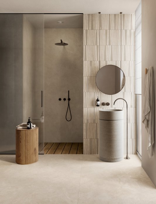 A Realstone Classica foi concebida para criar continuidade entre espaços, permitindo a aplicação em pavimentos e revestimentos cerâmicos com coerência estética.