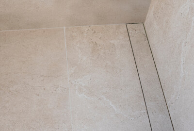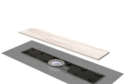 Sistema de grelha de duche oculta ao nível do pavimento, com desaguamento linear sob a peça cerâmica. Desenvolvido para bases de duche com pendentes em 1, 2 ou 3 direções, permitindo continuidade visual sem grelhas à vista.